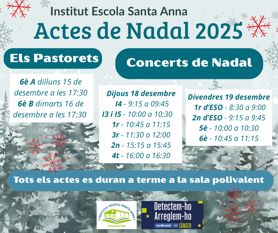 L’Institut Escola Santa Anna us convida a gaudir dels tradicionals Actes de Nadal 2025, que celebrarem a la sala polivalent del centre. Serà una ocasió especial per compartir l’esperit nadalenc amb tota la comunitat educativa. Enguany, a més, col·laborem amb La Marató de TV3, que aquest any recapta fons per a la recerca per a la curació del càncer sota el lema “Detectem-ho, arreglem-ho”. ELS PASTORETS 6è A – Dilluns 15 de desembre, a les 17:30 h 6è B – Dimarts 16 de desembre, a les 17:30 h. CONCERTS DE NADAL Dijous 18 de desembre I4 – de 9:15 a 9:45 I3 i I5 – de 10:00 a 10:30 1r – de 10:45 a 11:15 3r – de 11:30 a 12:00 2n – de 15:15 a 15:45 4t – de 16:00 a 16:30 Divendres 19 de desembre 1r d’ESO – de 8:30 a 9:00 2n d’ESO – de 9:15 a 9:45 5è – de 10:00 a 10:30 6è – de 10:45 a 11:15. Us hi esperem a tots i totes per celebrar plegats aquestes dates tan especials! Bon Nadal! 🎄✨