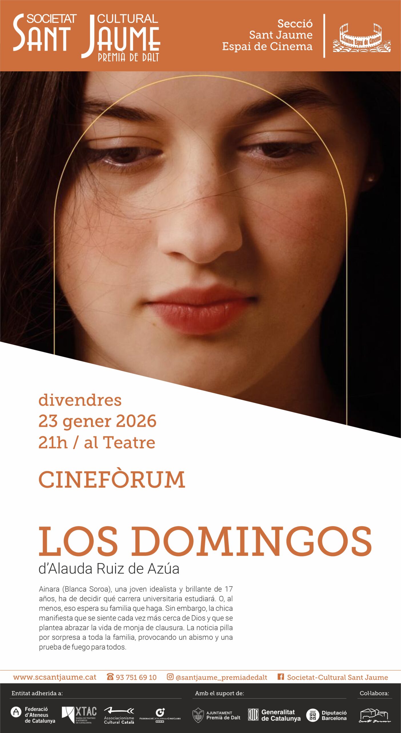 🎬 CINEFÒRUM · AQUEST DIVENDRES Aquest divendres 23 de gener, a la Secció Espai Cinema, projecta LOS DOMINGOS, d’Alauda Ruiz de Azúa. Una història íntima i delicada sobre l’Ainara, una jove de 17 anys que, davant les expectatives familiars, sent una crida profunda cap a la fe i es planteja entrar en un convent de clausura. Una decisió que sacseja profundament l’equilibri familiar.
