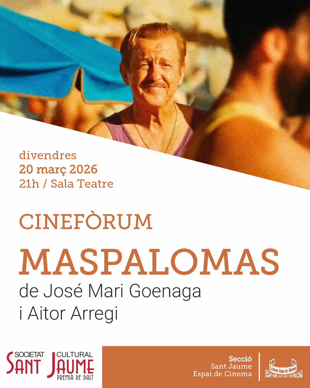 Divendres 20 de març, a la Secció Espai Cinema, projectem MASPALOMAS, de Jose Mari Goenaga i Aitor Arregi. Una proposta valenta i plena de sensibilitat que explora identitats, desitjos i contradiccions amb la mirada honesta i precisa dels seus directors. Un relat que combina emoció, profunditat i una gran força narrativa.