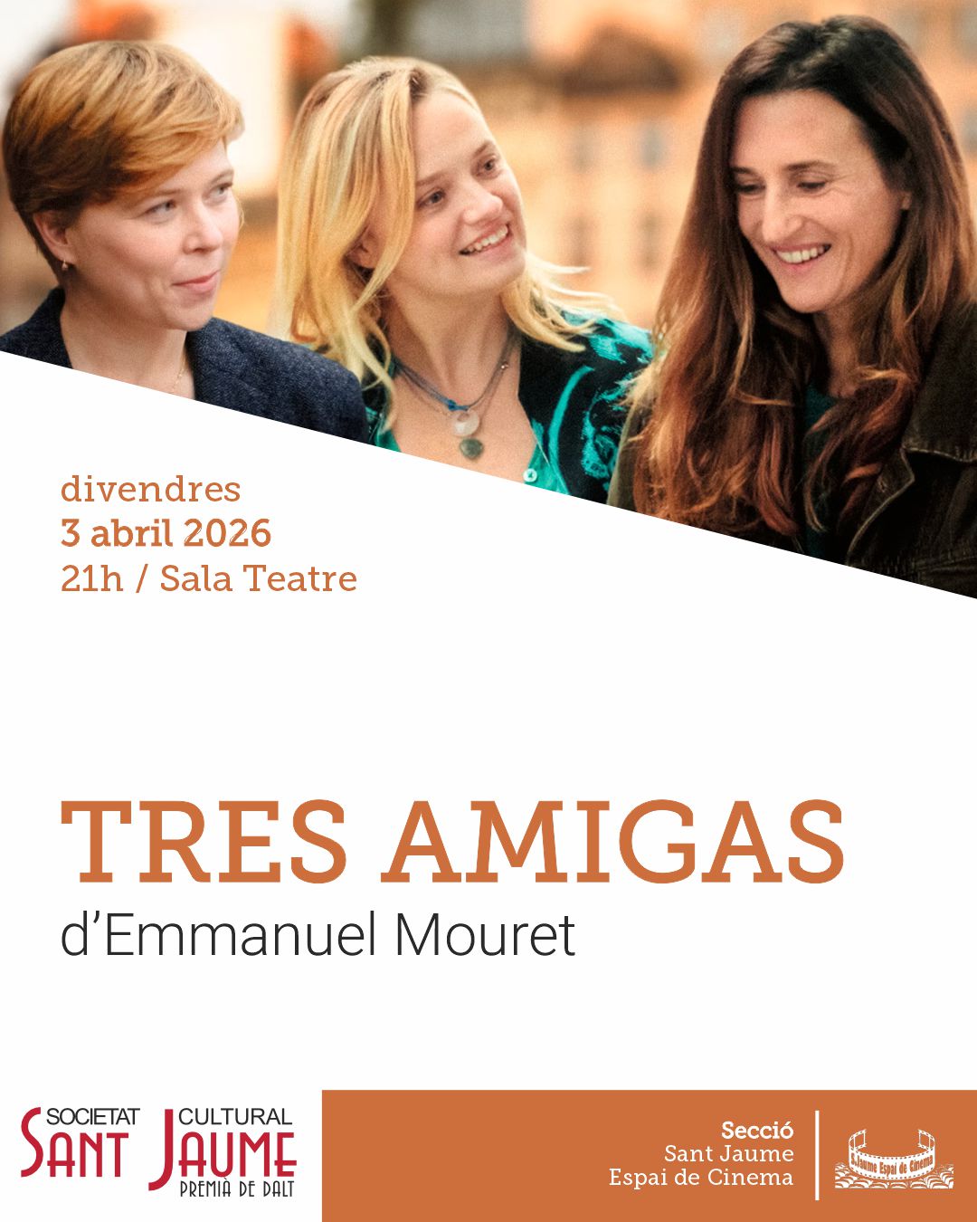 El proper divendres 3 d’abril, a la Sala del Teatre, projectem TRES AMIGAS, del director Emmanuel Mouret. Una comèdia delicada i intel·ligent sobre l’amistat, l’amor i les contradiccions emocionals que ens defineixen. Amb el seu estil elegant i ple de matisos, Mouret ens ofereix un relat fresc i subtil sobre les relacions humanes, ple de diàlegs brillants i situacions tan quotidianes com reveladores.