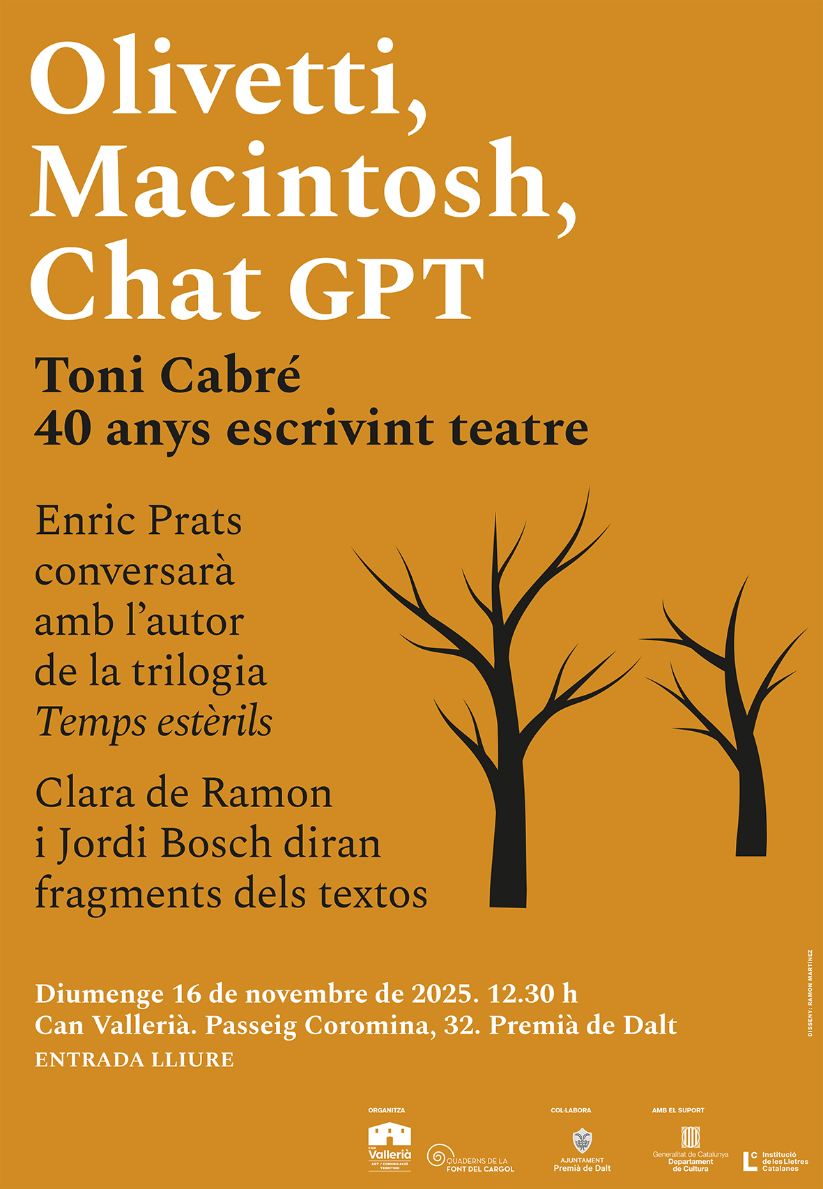 Toni Cabré fa 40 anys que publica teatre i ho celebrarem amb l’autor, que conversarà amb Enric Prats sobre “Temps estèrils”, el recull de les tres últimes obres de Cabré, i els actors Jordi Bosch i Clara de Ramon que ens diran fragments dels textos. I acabarem fent el vermut i brindant pel teatre.