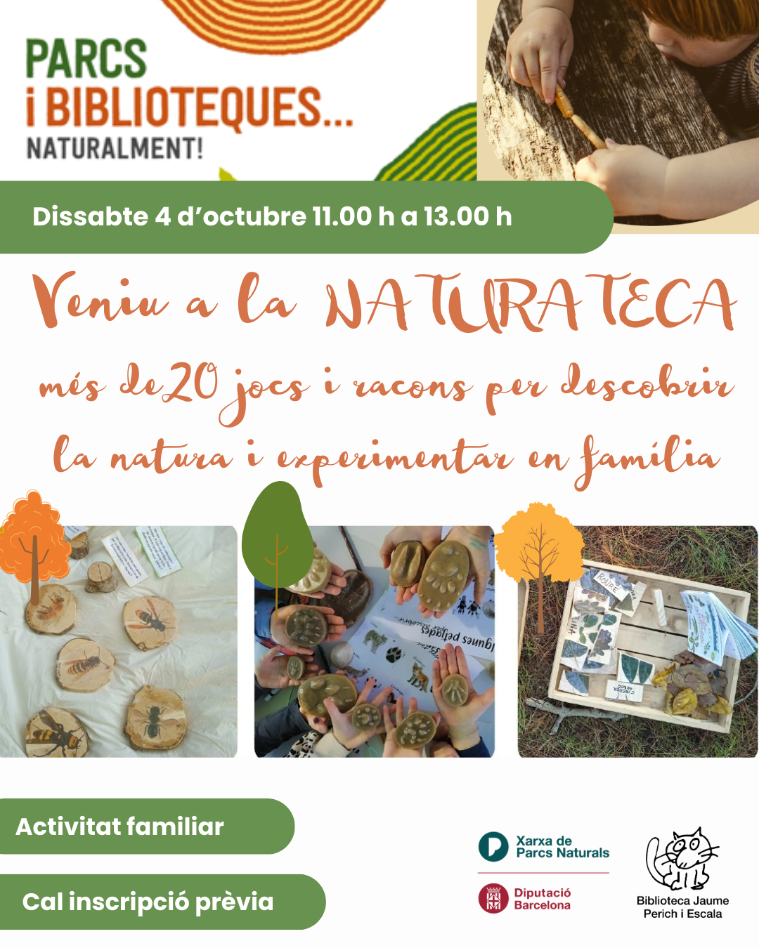El primer cap de setmana d’octubre se celebra, arreu del món, el A la Naturateca on hi trobareu més de 20 jocs i racons per descobrir la natura i experimentar en família. És una experiència única on els infants descobreixen la natura jugant, tocant i experimentant amb materials reals.