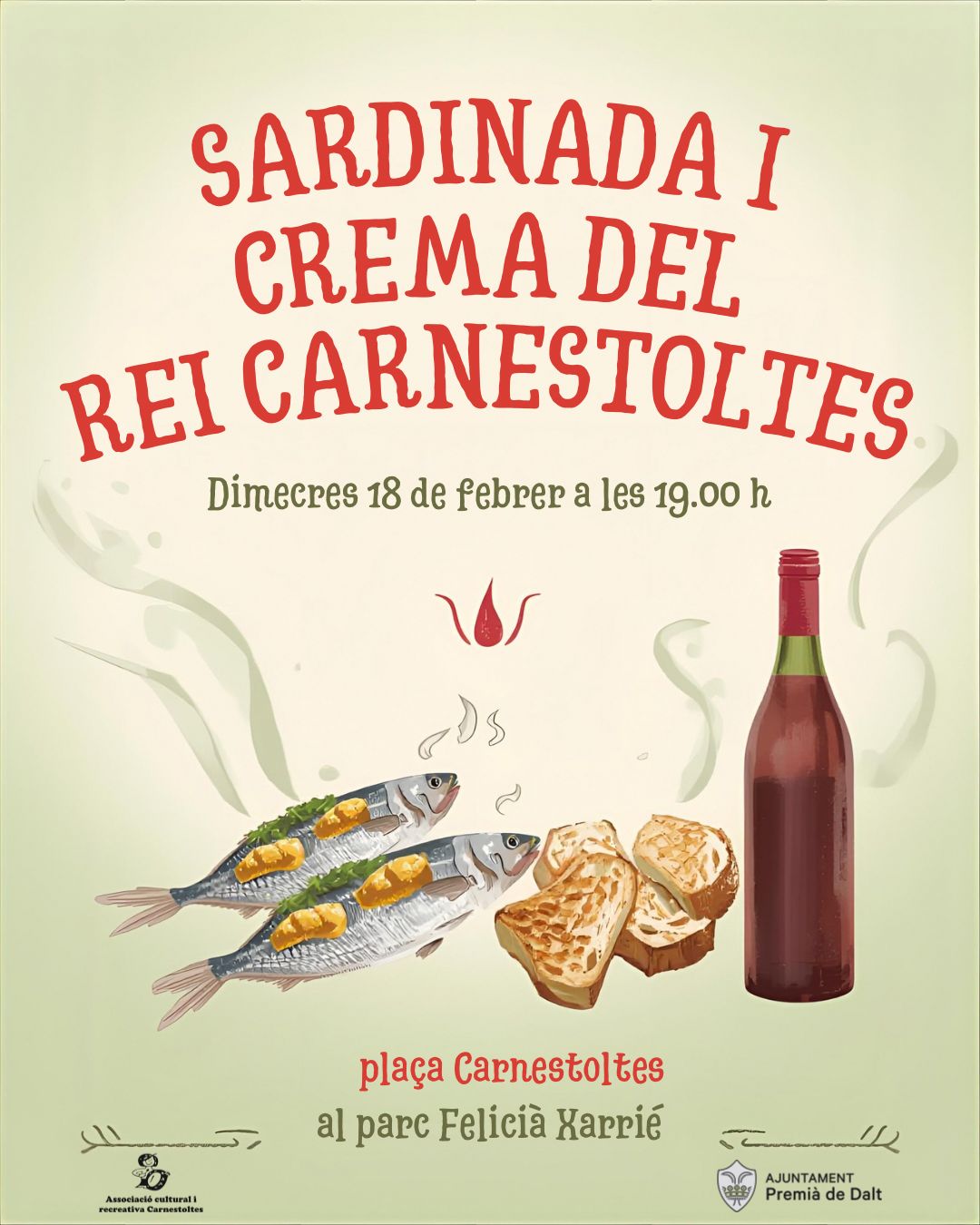 Data febr. 18 2026 Caducat! Hora 19:00 – 21:30 Sardinada i Crema del Rei Carnestoltes Sardinada popular i Crema del Rei Carnestoltes Comparteix aquest esdeveniment + Afegir a Google Calendar Exportació a + iCal / Outlook