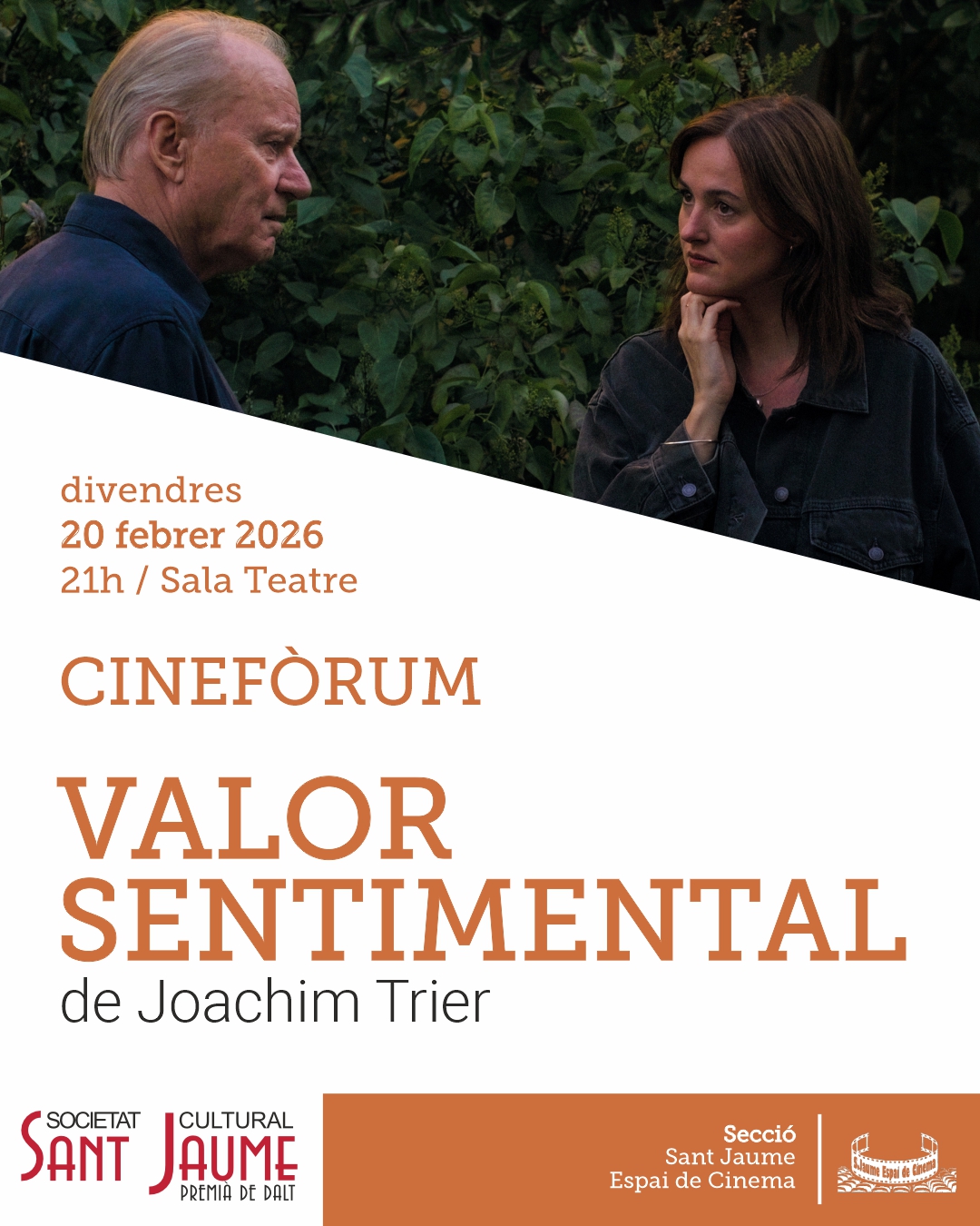 🎬 CINEFÒRUM El divendres 20 de febrer, a la Secció Espai Cinema, projectem VALOR SENTIMENTAL, de Joachim Trier. Una obra mestra del cinema europeu recent, aclaparadorament celebrada per la crítica internacional. Un drama profund, sensible i elegant que explora les relacions familiars, la memòria i els vincles emocionals amb una precisió i una humanitat extraordinàries.